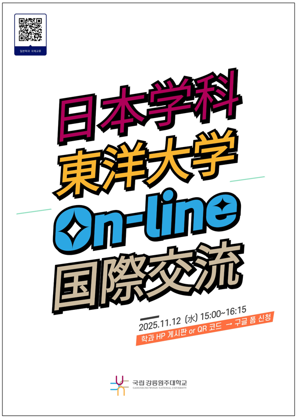 일본학과가 주최하는 일본 도요대학(東洋大学)과의 두 번째 온라인 국제교류가 11월 12일(수)에 열립니다.